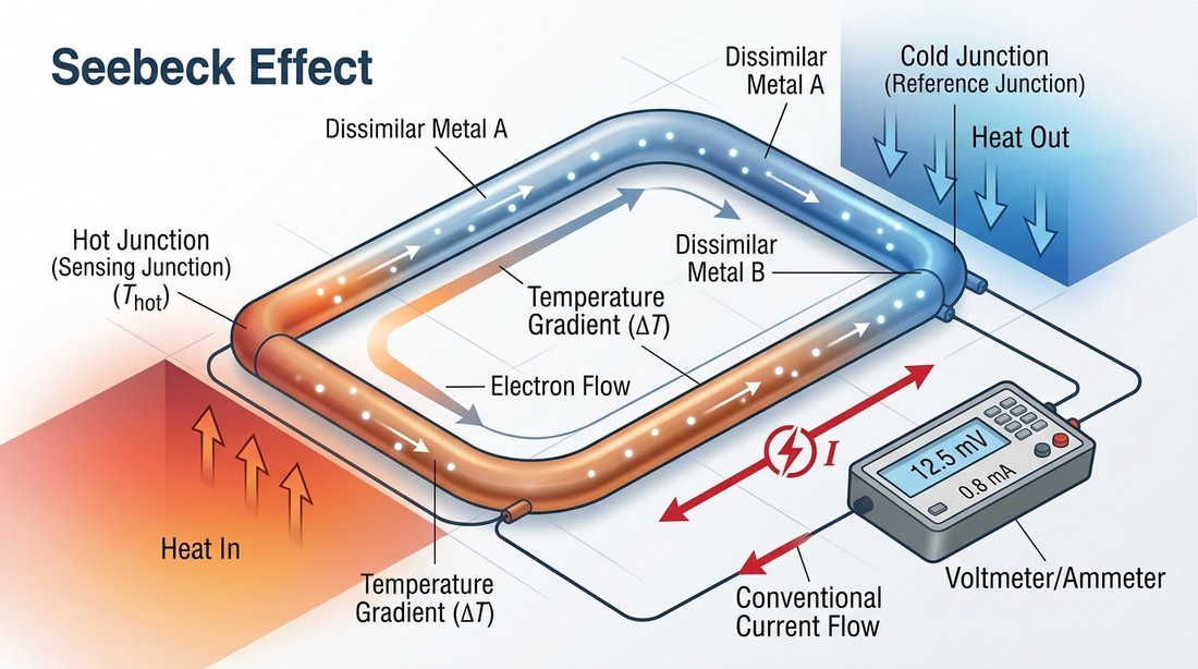 هذه الظاهرة، التي اطلق عليها لاحقا “تاثير سيبك”، تعتمد على مبدا بسيط في ظاهره، عميق في باطنه: حين يوجد فرق في درجة الحرارة بين طرفي موصلين مختلفين، تنشا قوة دافعة كهربائية (Electromotive Force) تدفع الالكترونات للحركة من الجانب الساخن نحو الجانب البارد، مولدة تيارا كهربائيا قابلا للقياس والاستخدام.
